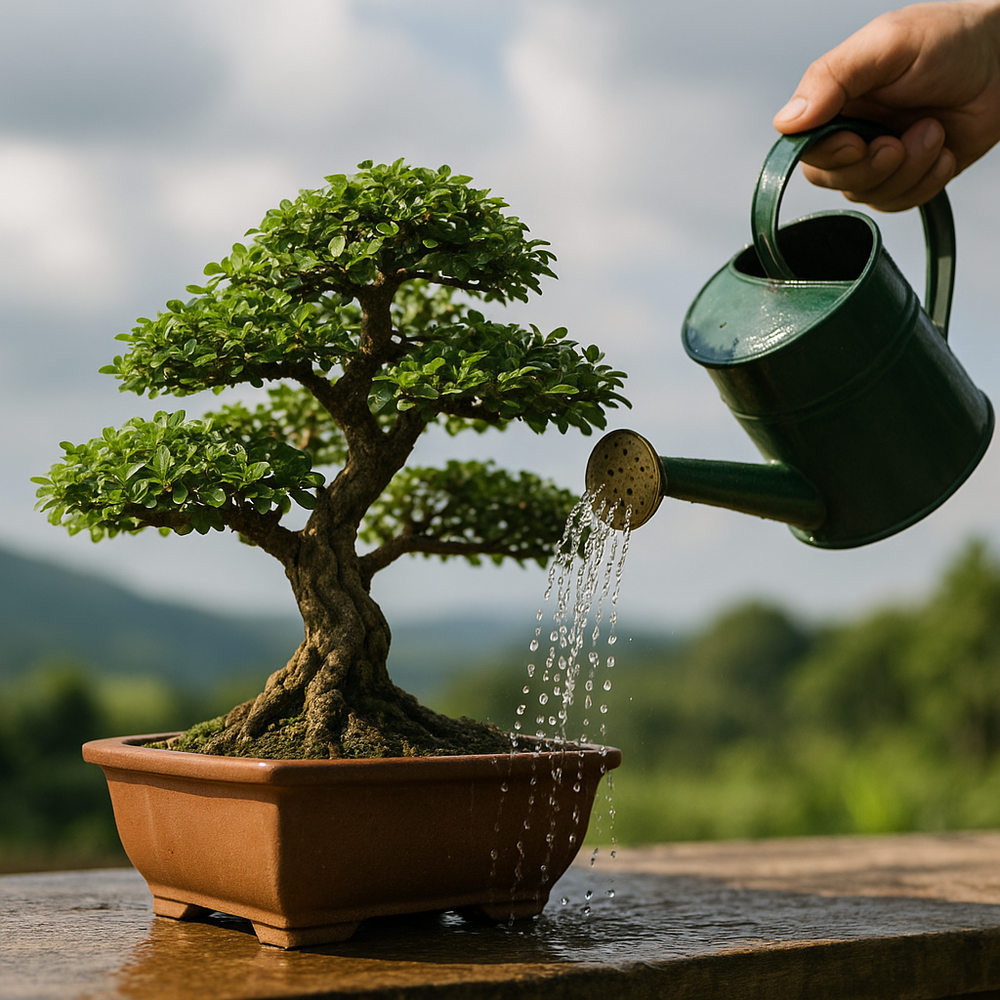El riego es uno de los aspectos más delicados en los cuidados de bonsáis en agosto, debido a los cambios constantes de temperatura y humedad. No basta con mirar la superficie del sustrato, ya que puede parecer seca mientras la parte inferior aún está húmeda. Una buena práctica es introducir un palillo delgado de madera en la tierra para verificar si hay humedad interna antes de regar.